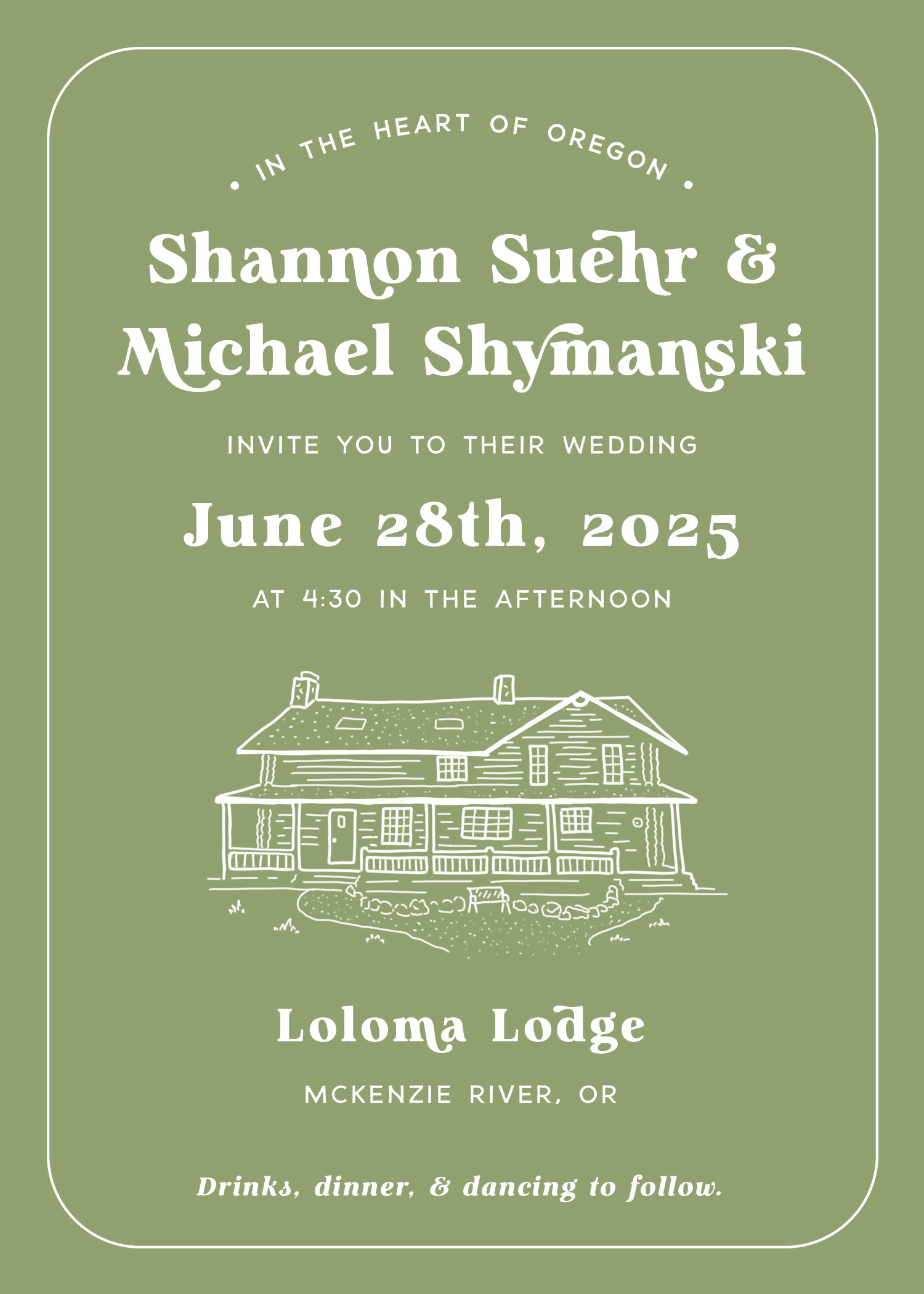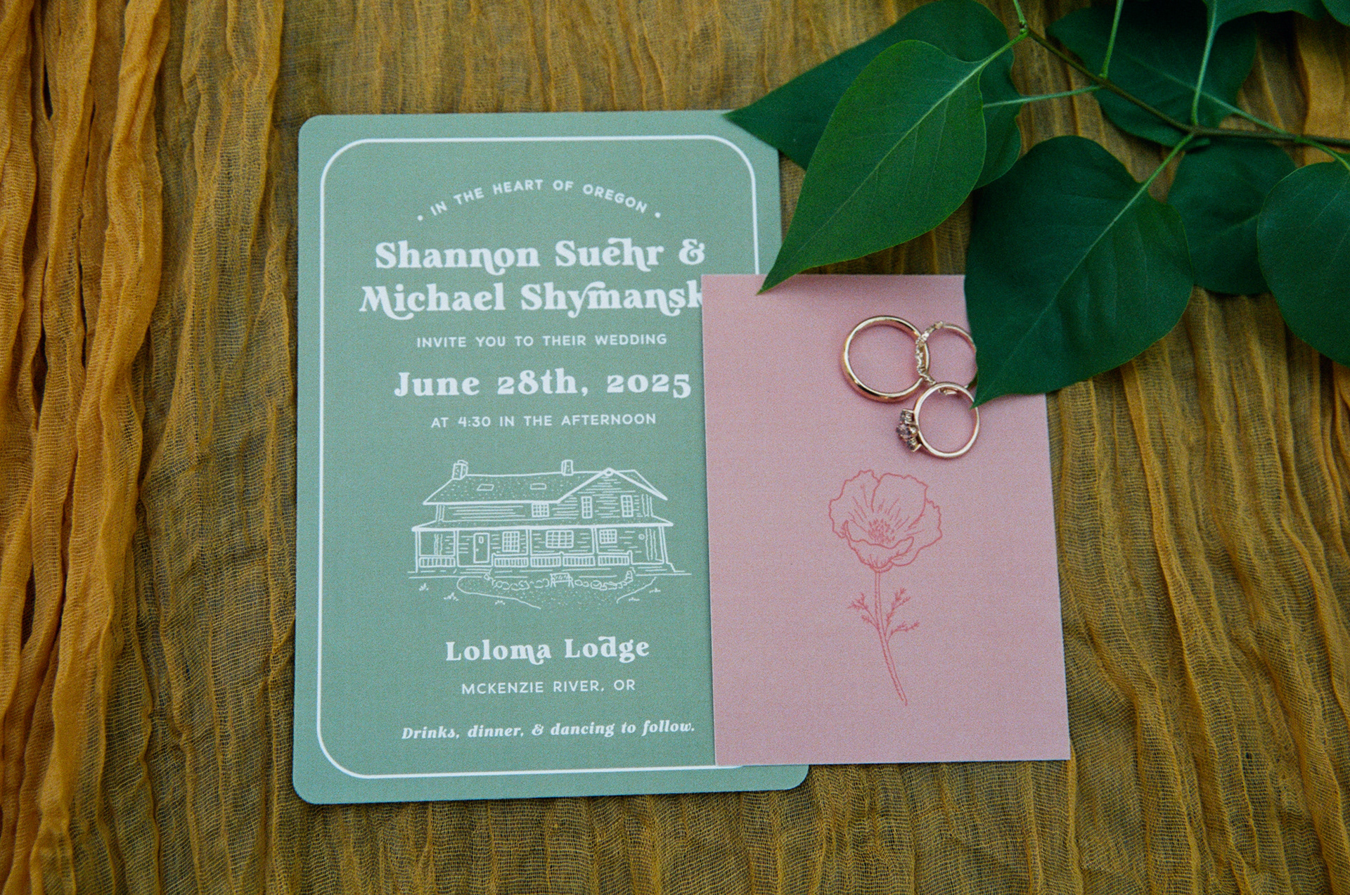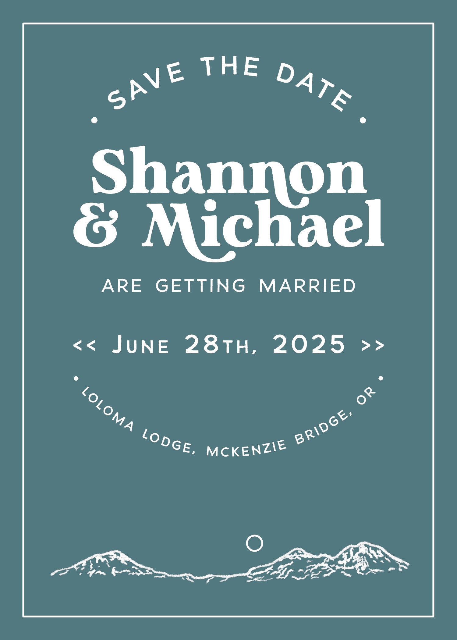 Our first touchpoint, I illustrated the Three Sisters and put together several designs for our save the dates with our selected fonts and color palette.