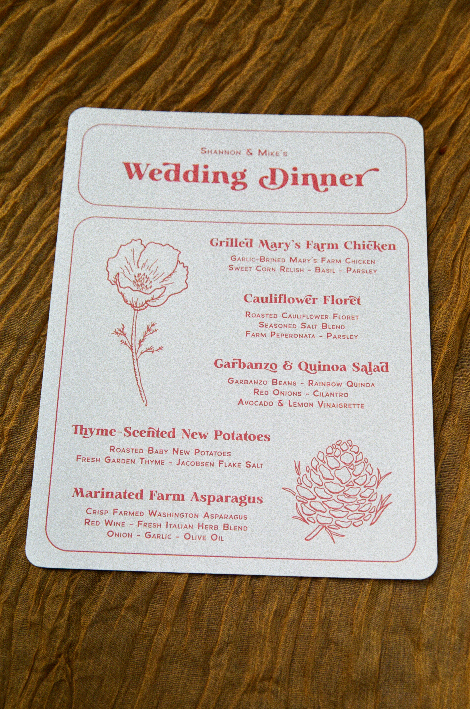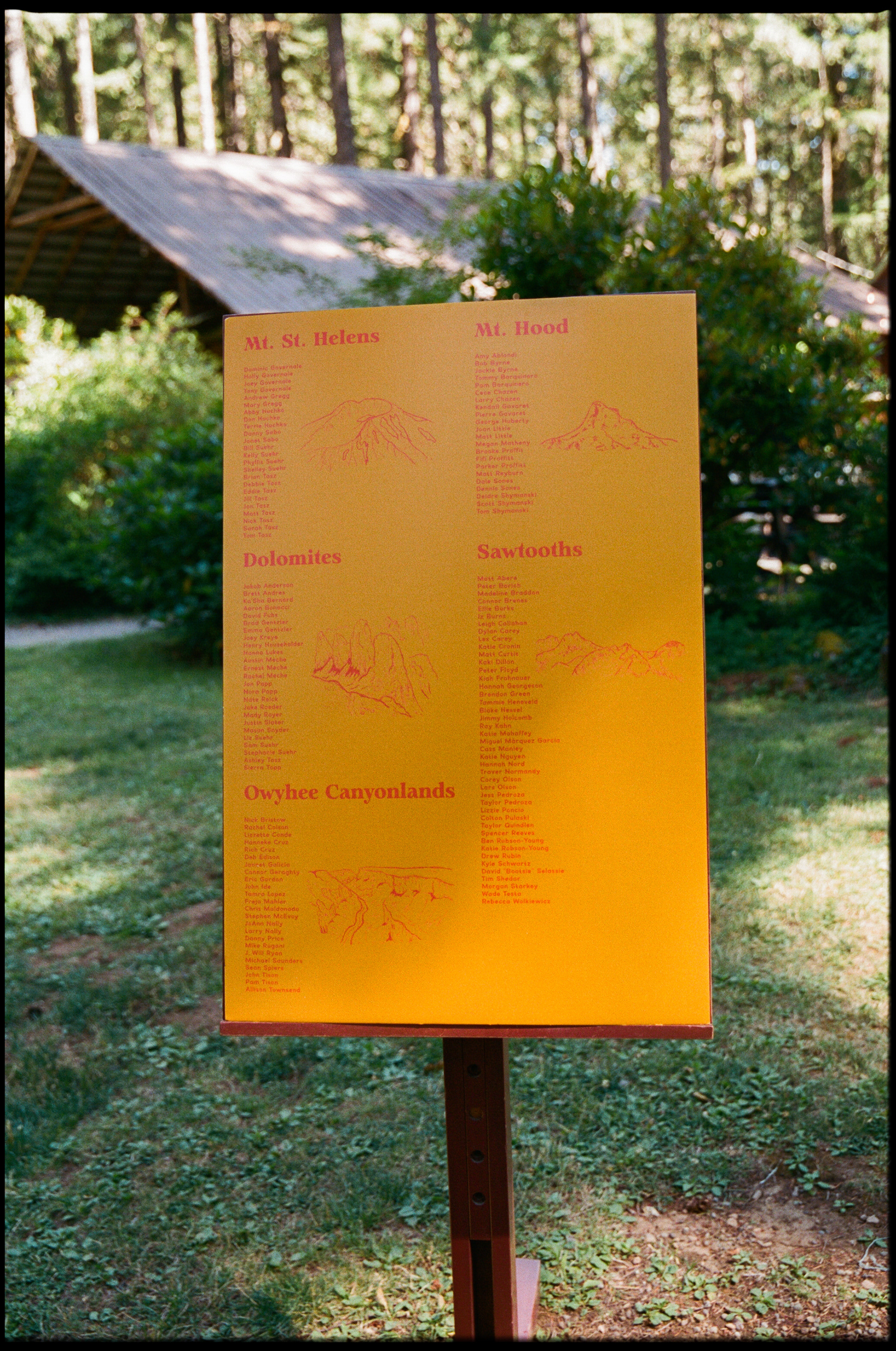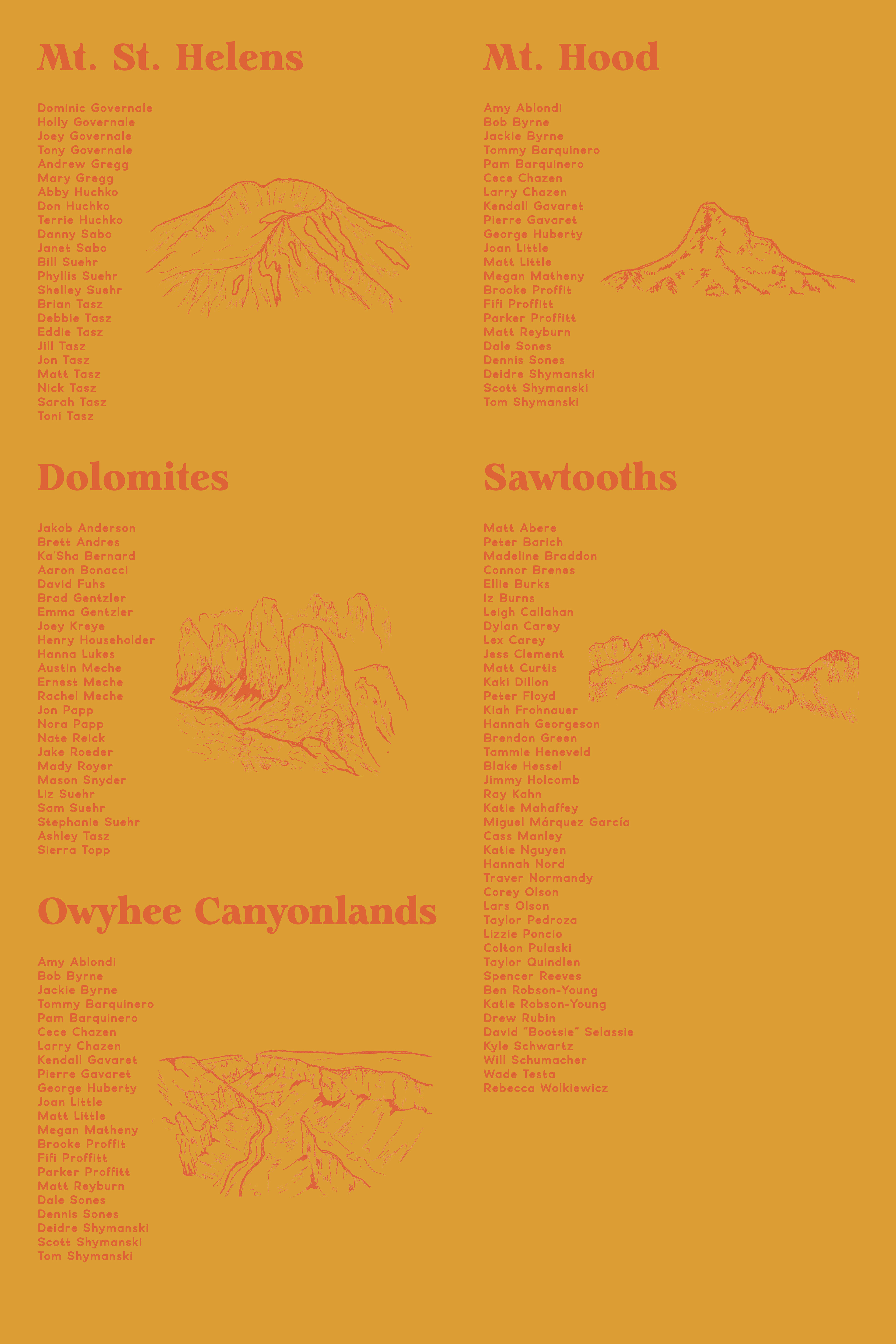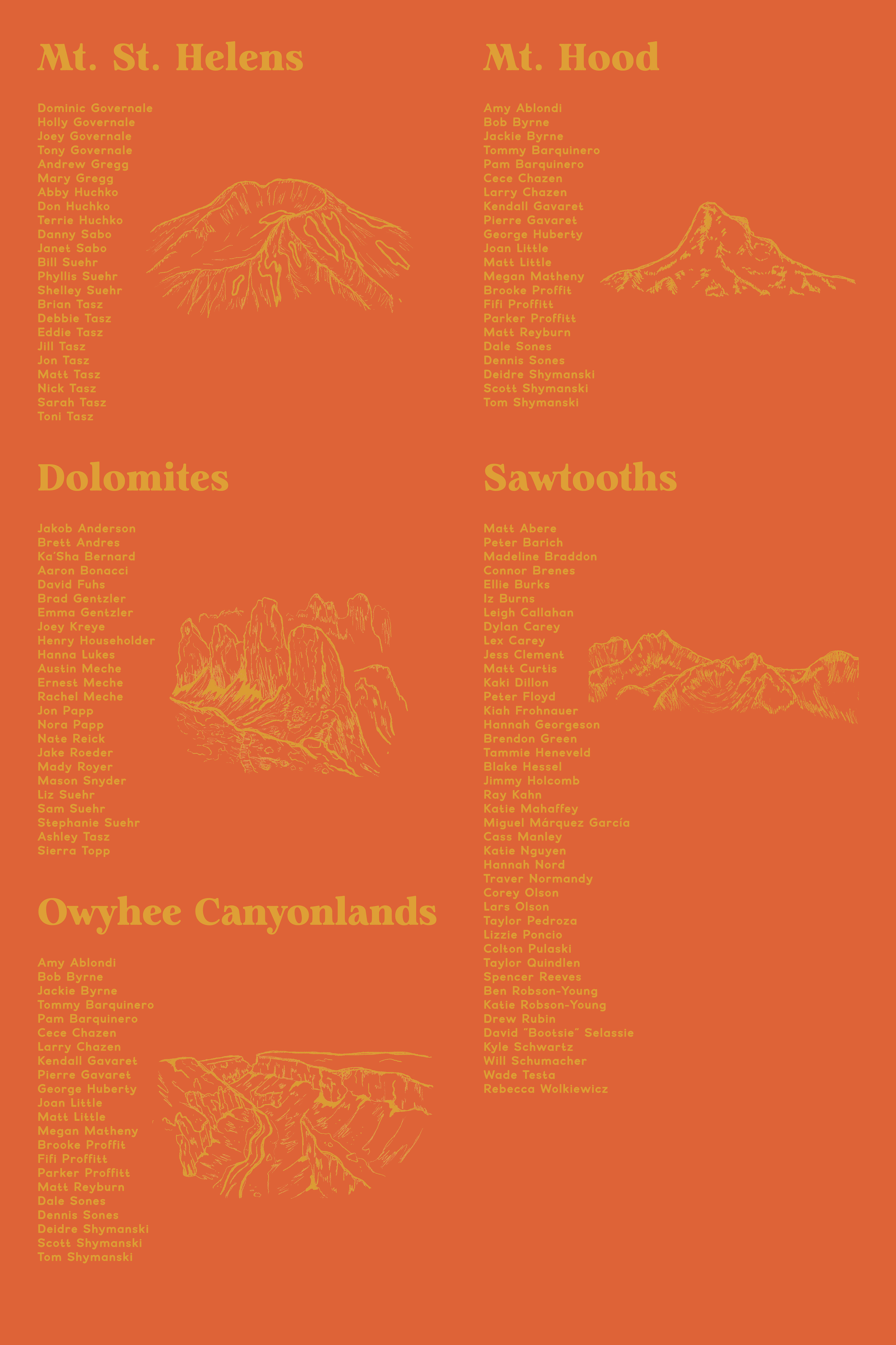 I illustrated the Dolomites (coral pink), Mt. Hood (dark blue), Mt. St. Helens (seafoam green), the Owyhee Canyonlands (orange), and the Sawtooth Mountains (moss green) for table settings and also seating charts.
