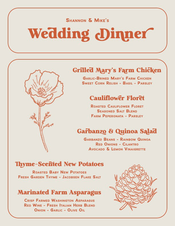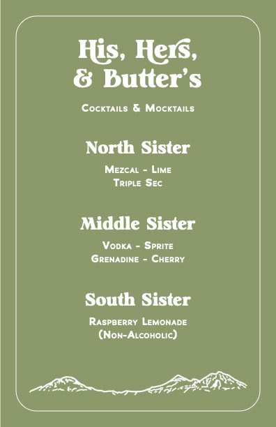 In recycling most assets, I created a cocktail menu around the Three Sisters mountains nearby and laid out a dinner menu to button up all the design and illustrations at our wedding.